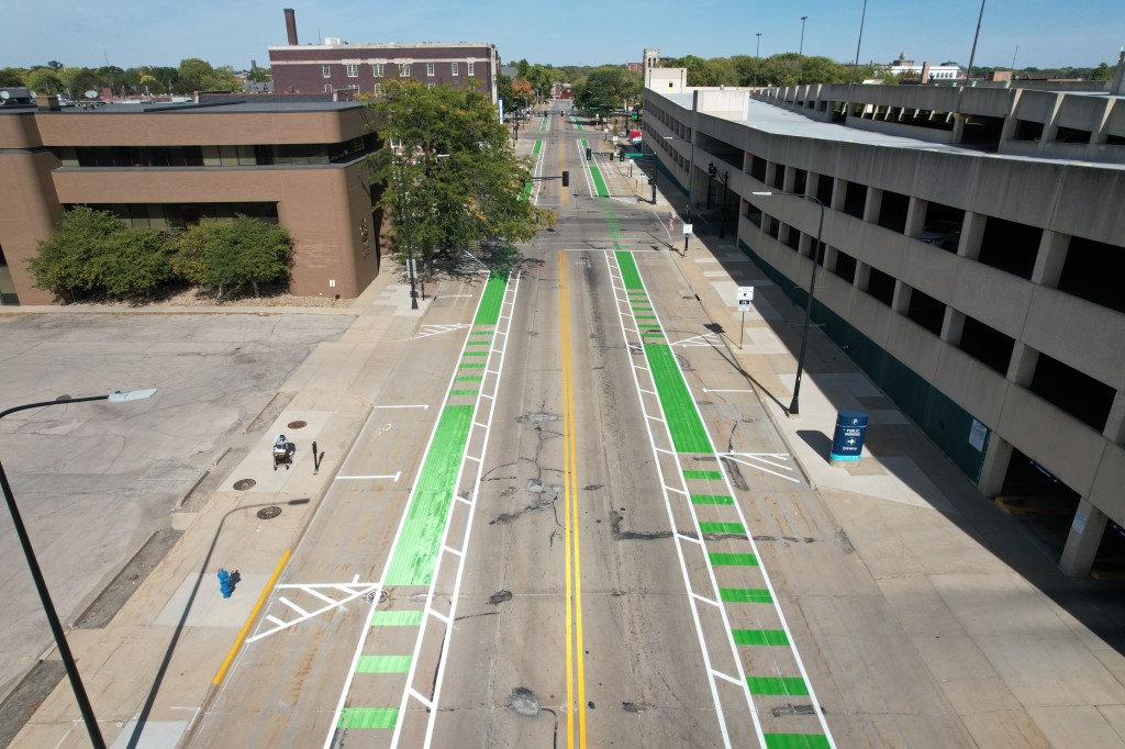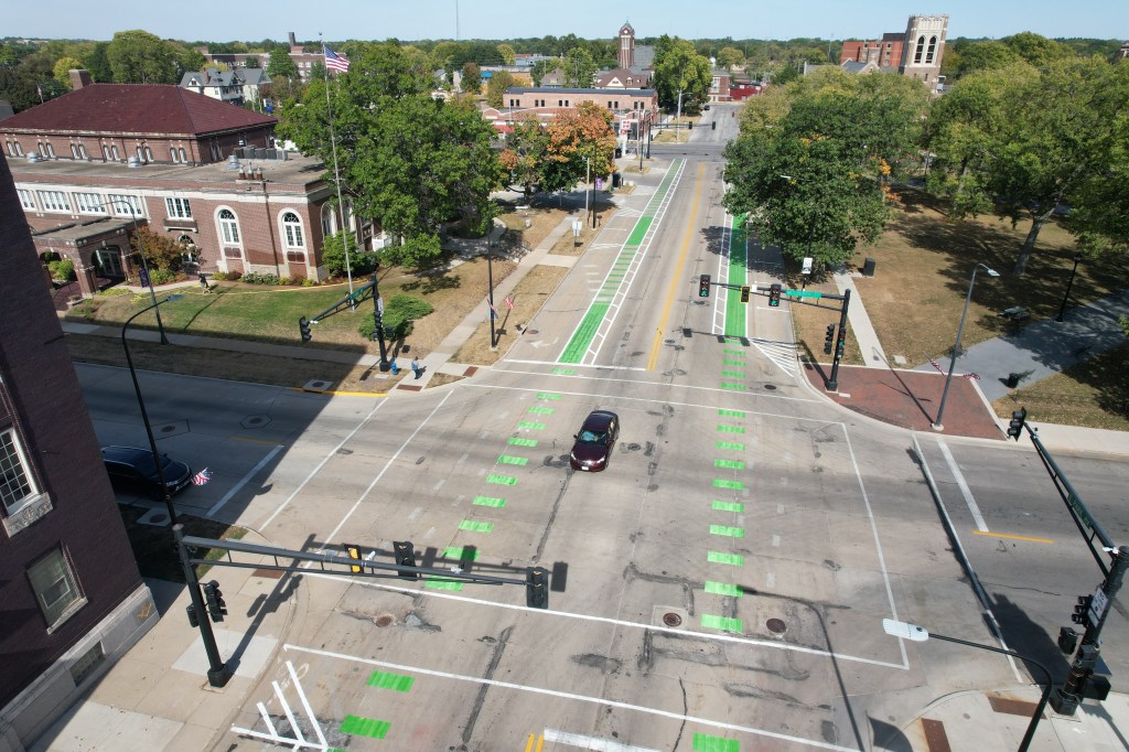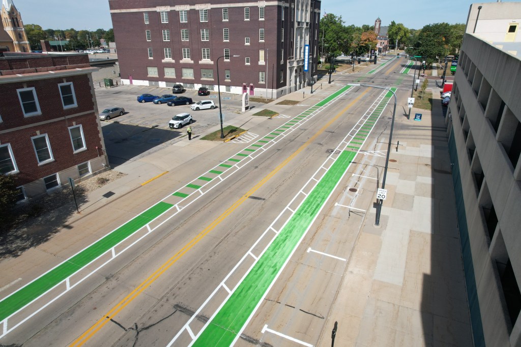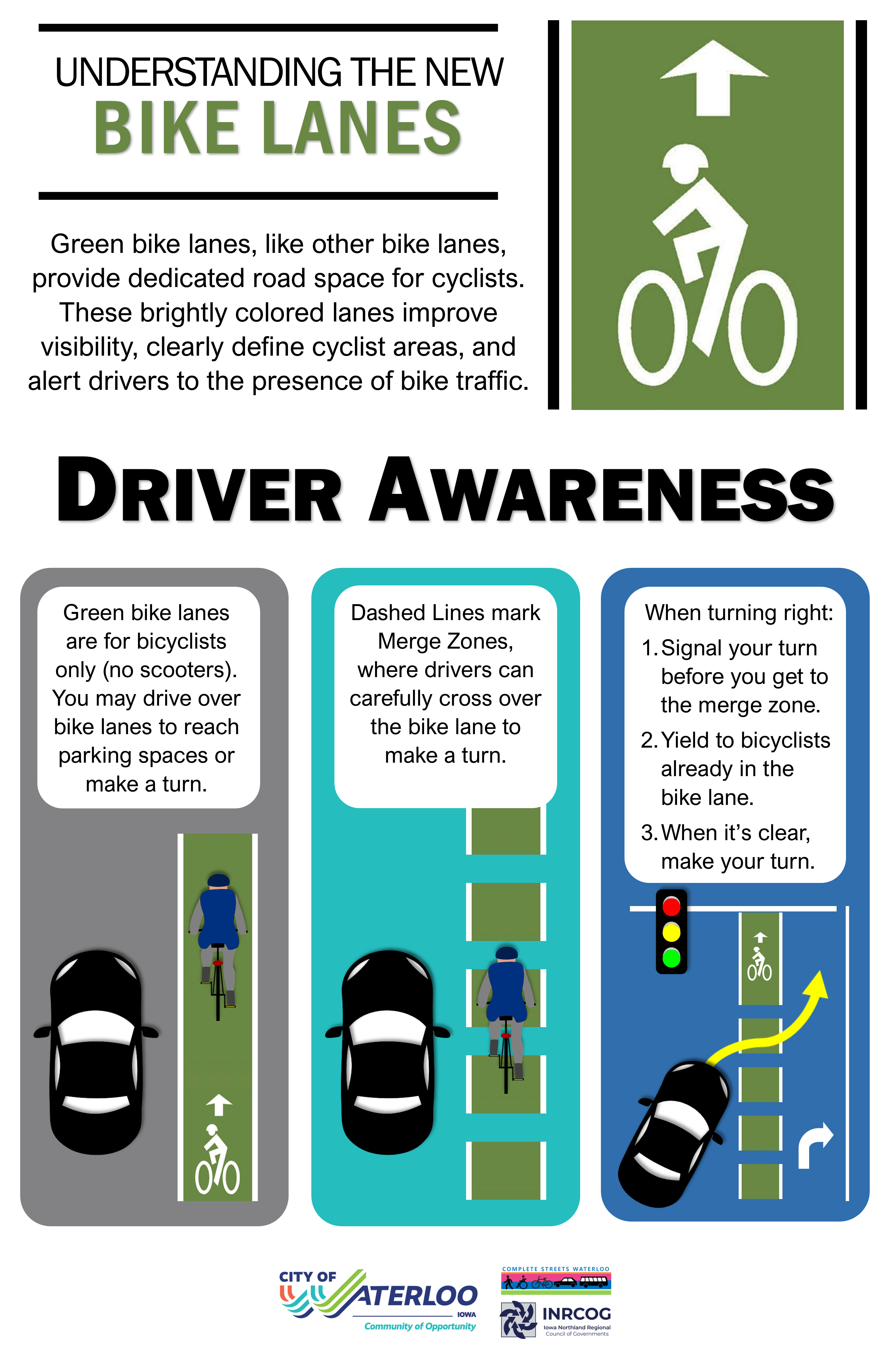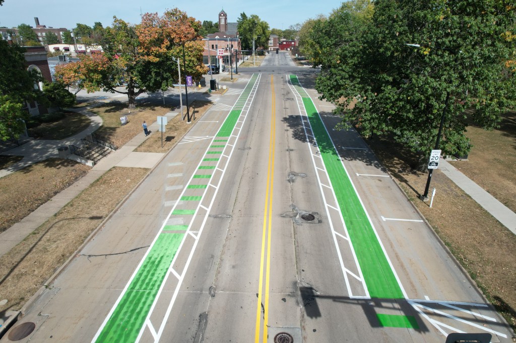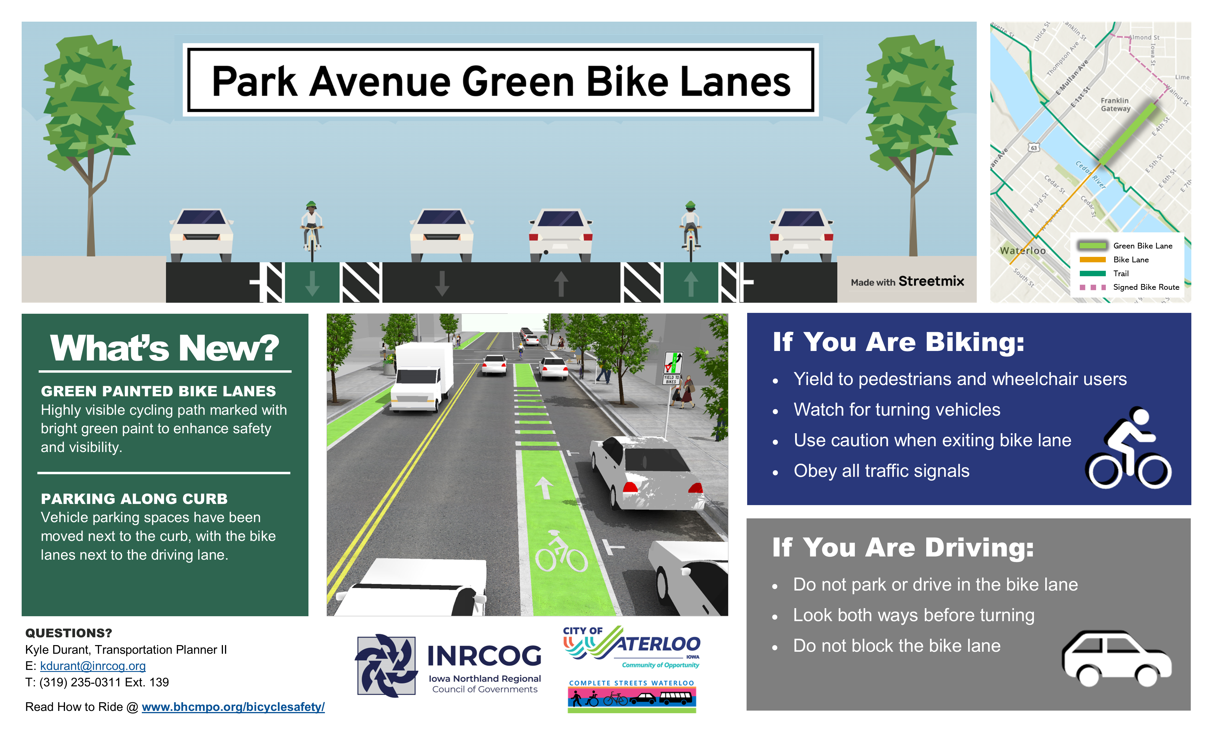The first green painted bike lanes in the Black Hawk County metro have been installed on Park Avenue in Waterloo, from Franklin Street to the new Park Avenue Bridge! The new design will make the bike lanes easy to see, creating a “Greenway” through the heart of downtown. The project seeks to minimize conflicts between cyclists and motorists, enhancing safety and improving the overall roadway experience for everyone. Plans are in place to extend the green bike lanes south to South Street in conjunction with future reconstruction or pavement rehab of Park Avenue, with the exact timing to be determined.