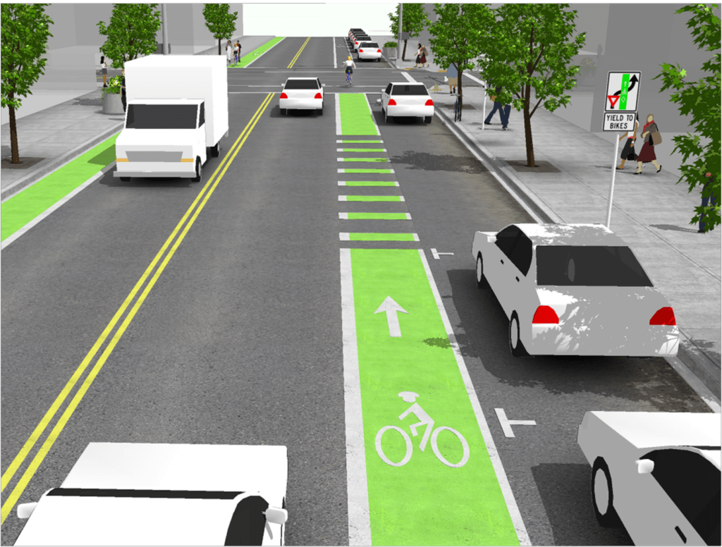 Brightly colored sections of the road designated for cyclists. Their purpose is to enhance visibility, clearly mark where cyclists should ride, and alert drivers to the presence of bike traffic. For bicyclists, they provide a safer, more defined space to travel. For motorists, they serve as a reminder to watch for cyclists and reduce conflicts at intersections and other areas of shared roadway.