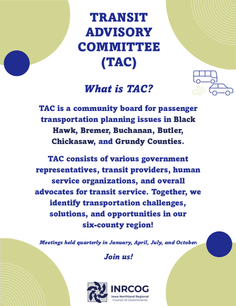 Interested in all things Transit? We’d love to have you join our Transit Advisory Committee (TAC) meetings! Everyone is welcome to attend. Our meetings are held quarterly in the INRCOG board room. If you have any questions or want more information, feel free to reach out to Nick Fratzke.