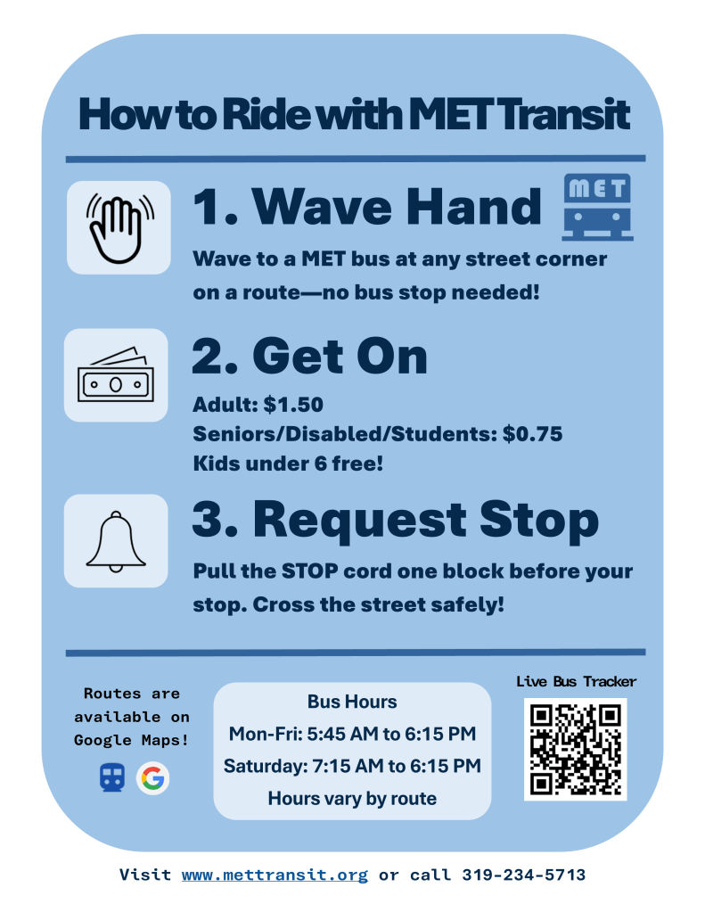 Riding the bus with MET is super easy! Just follow these 3 steps: