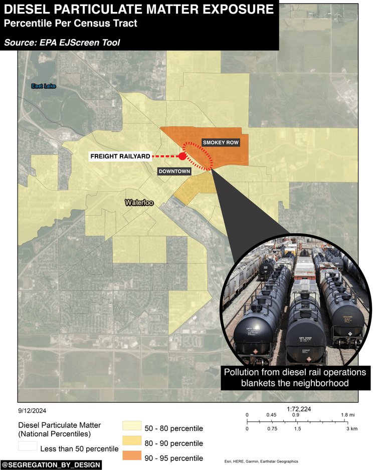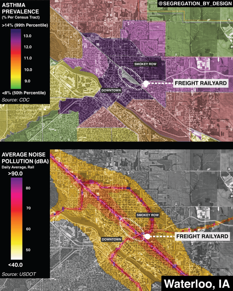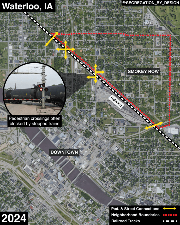 | The CN Railyard, located in the heart of Waterloo, creates significant barriers for the community. It causes disruptions in mobility and safety, particularly on major roads like East 4th Street, which is hindered by long crossing delays. The railyard contributes to air and noise pollution, exacerbating health issues such as asthma and disabilities in the surrounding area. These challenges are compounded by a history of redlining, segregation, and limited investment, resulting in diminished property values and economic stagnation, particularly in the Smokey Row Triangle. | The City of Waterloo is conducting the Downtown Railyard Relocation and Railroad Crossing Improvement Study to evaluate relocating the railyard and improving crossings. The study aims to enhance safety, air and noise quality, and create economic opportunities. It will involve analysis, community engagement, and collaboration with stakeholders to develop solutions that improve public health, mobility, and quality of life. Redeveloping the railyard site could lead to green spaces, economic revitalization, and a more equitable urban environment. |